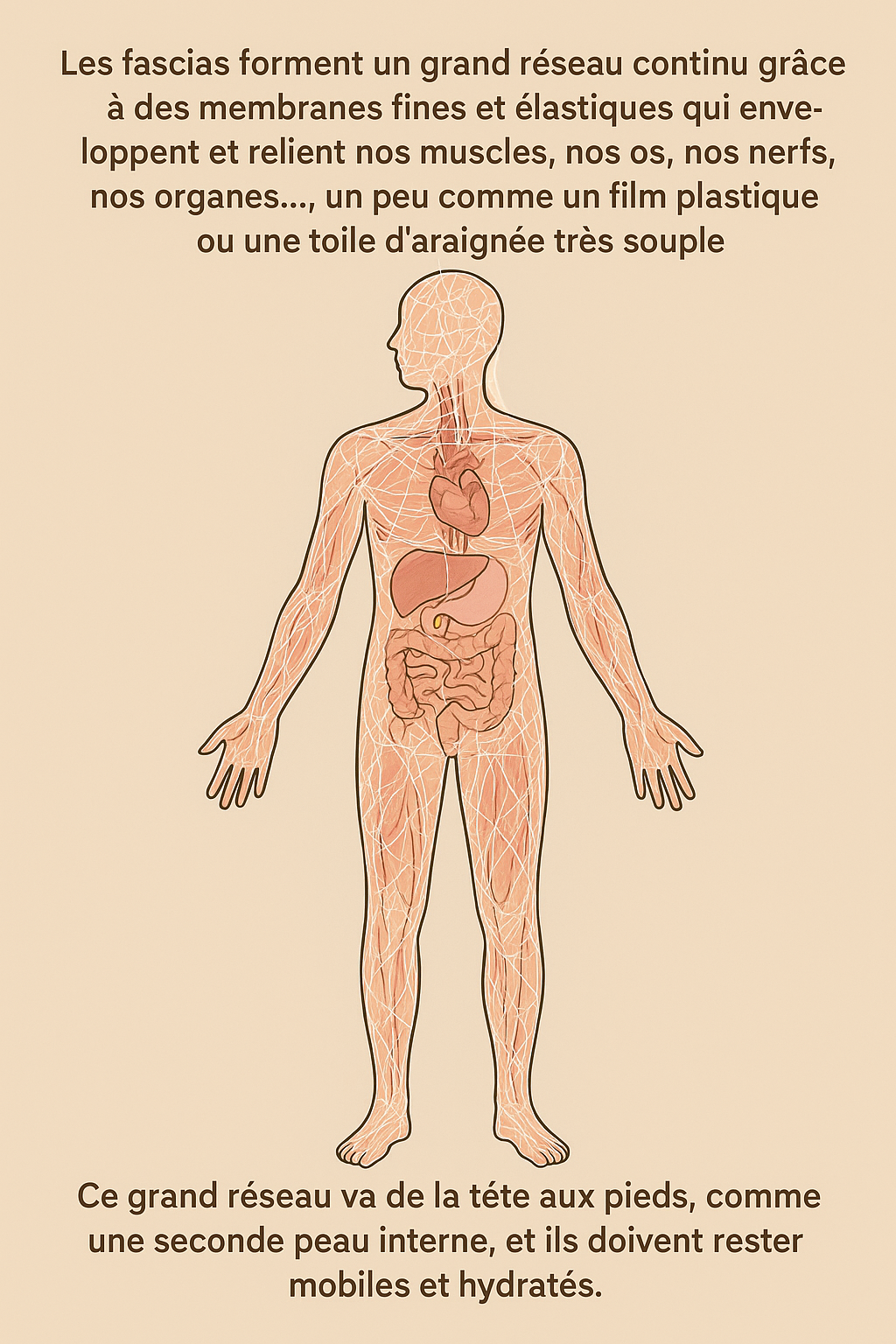 Les fascias sont des tissus qui enveloppent muscles, os et organes ; ils doivent rester mobiles et hydratés.